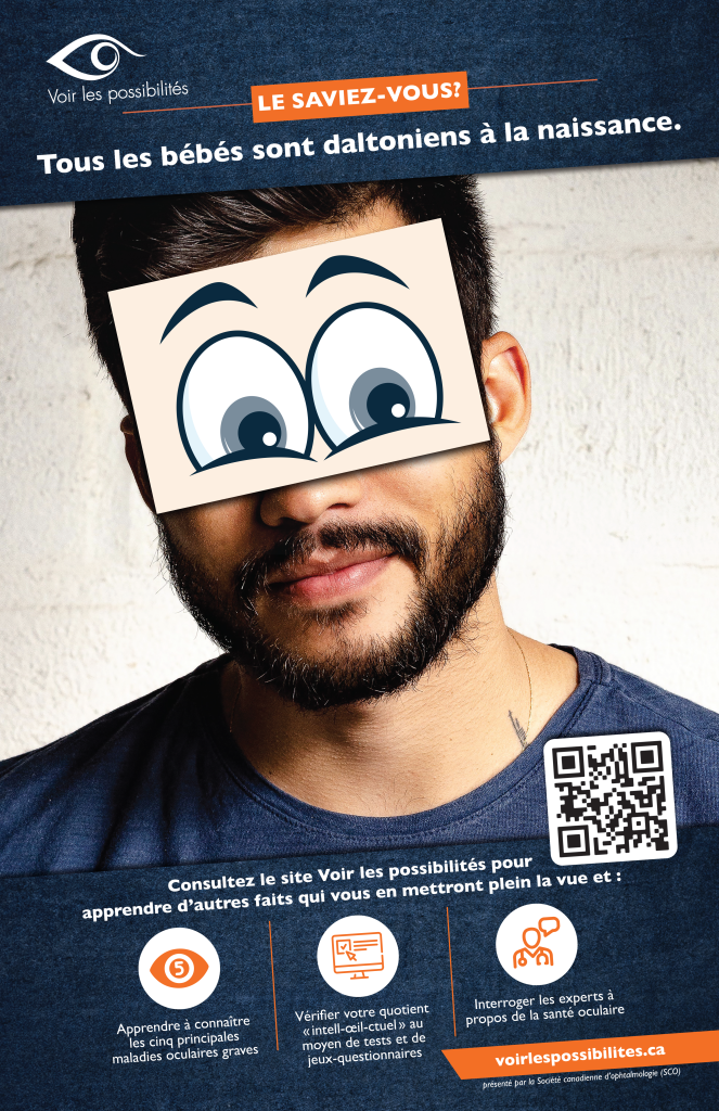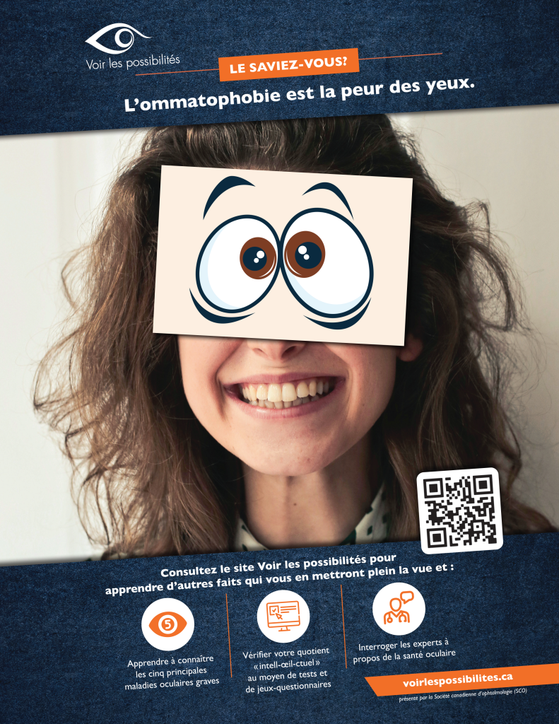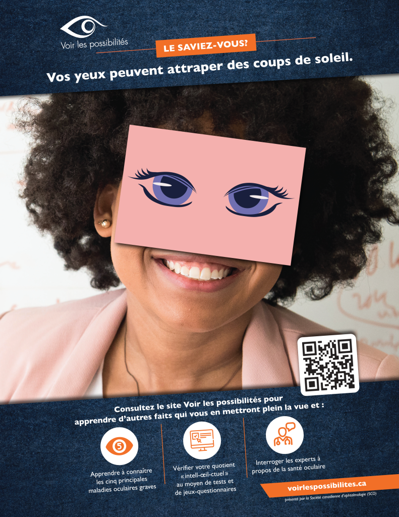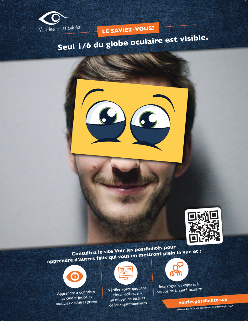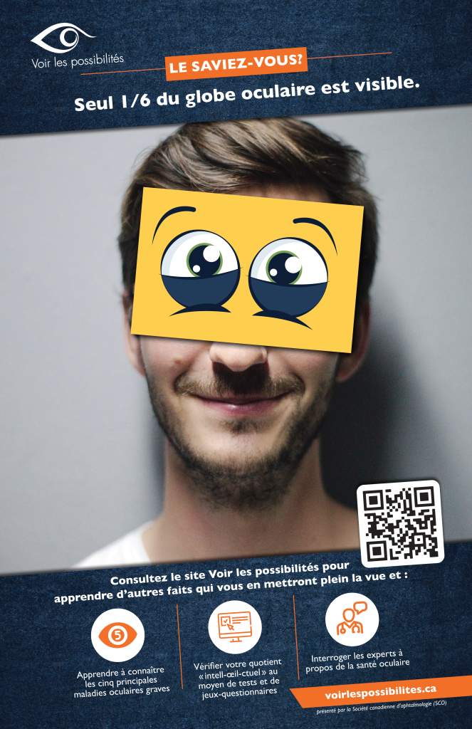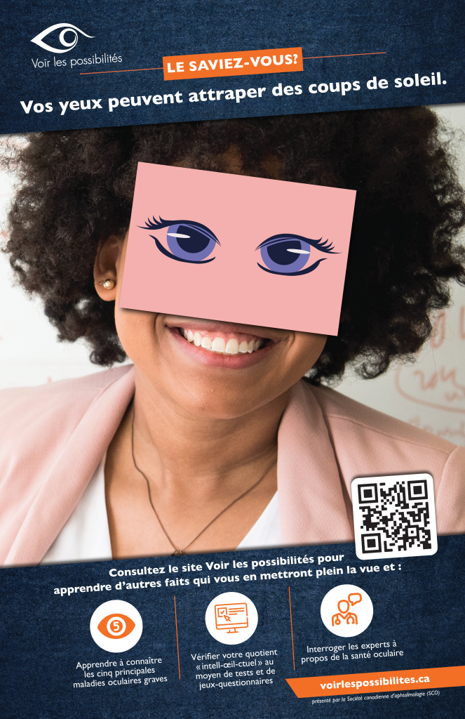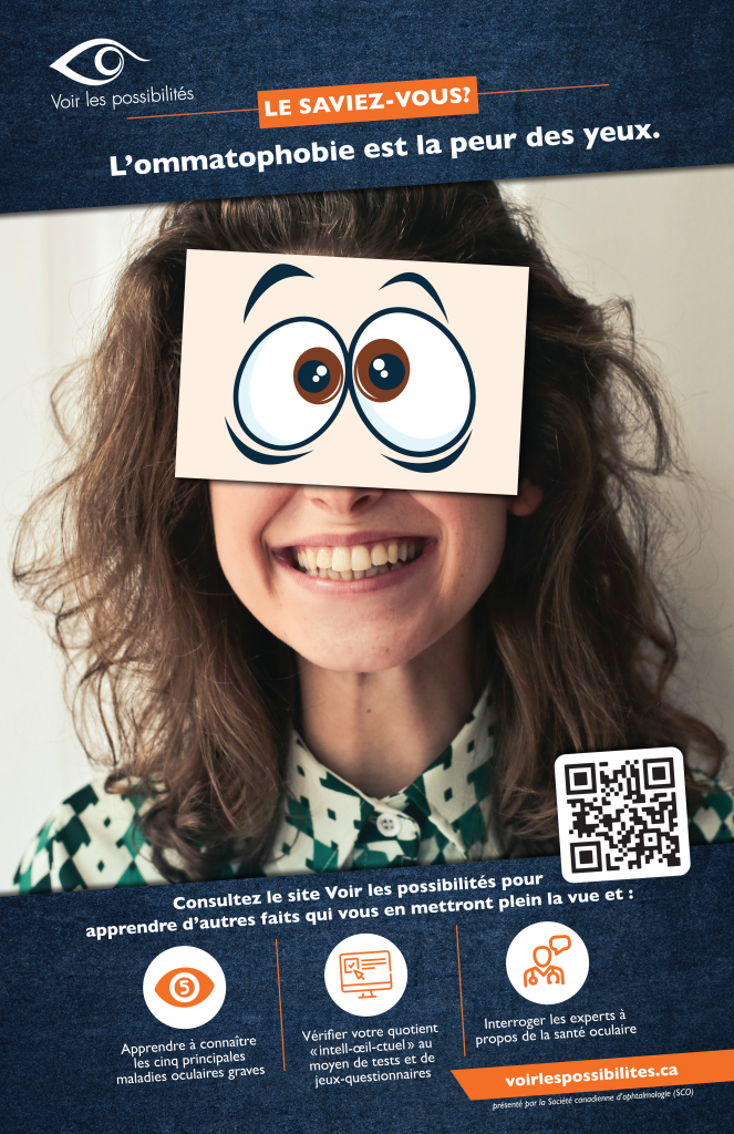 Amusantes et éducatives, ces affiches et cartes postales fournissent aux médecins et aux patients des renseignements intéressants sur la santé oculaire. Vous n’avez qu’à cliquer pour les télécharger et les imprimer sur demande. Accédez à d’autres ressources, y compris des jeux-questionnaires, des tests et une rubrique « Demander aux experts » sur le site voirlespossibilites.ca.